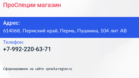 ПроСпеции, магазин по адресу 614068, Пермский край, Пермь, Пушкина, 104 лит АВ в дальнейшем Организация, размещена в следующих категориях: