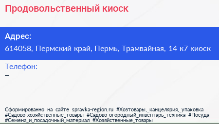 Продовольственный киоск по адресу 614058, Пермский край, Пермь, Трамвайная, 14 к7 киоск в дальнейшем Организация, размещена в следующих категориях: