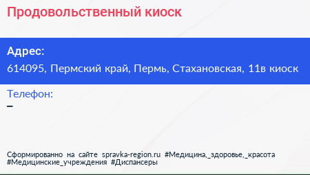 Продовольственный киоск по адресу 614095, Пермский край, Пермь, Стахановская, 11в киоск в дальнейшем Организация, размещена в следующих категориях: