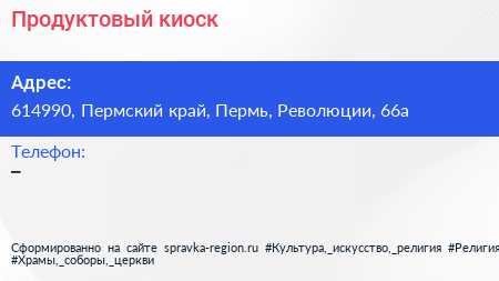 Продуктовый киоск по адресу 614990, Пермский край, Пермь, Революции, 66а в дальнейшем Организация, размещена в следующих категориях: