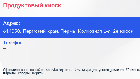 Продуктовый киоск по адресу 614058, Пермский край, Пермь, Колхозная 1-я, 2е киоск в дальнейшем Организация, размещена в следующих категориях: