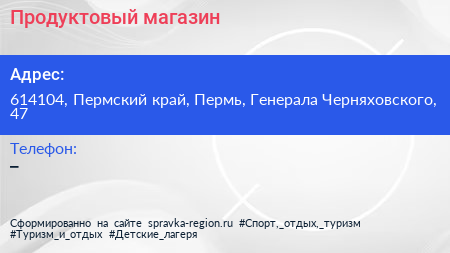 Продуктовый магазин по адресу 614104, Пермский край, Пермь, Генерала Черняховского, 47 в дальнейшем Организация, размещена в следующих категориях: