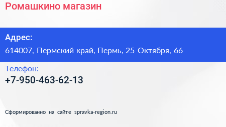 Ромашкино, магазин по адресу 614007, Пермский край, Пермь, 25 Октября, 66 в дальнейшем Организация, размещена в следующих категориях: