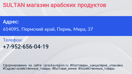 SULTAN, магазин арабских продуктов по адресу 614095, Пермский край, Пермь, Мира, 37 в дальнейшем Организация, размещена в следующих категориях: