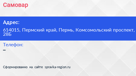 Самовар по адресу 614015, Пермский край, Пермь, Комсомольский проспект, 28Б в дальнейшем Организация, размещена в следующих категориях: