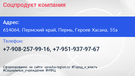 Соцпродукт, компания по адресу 614064, Пермский край, Пермь, Героев Хасана, 55а в дальнейшем Организация, размещена в следующих категориях: