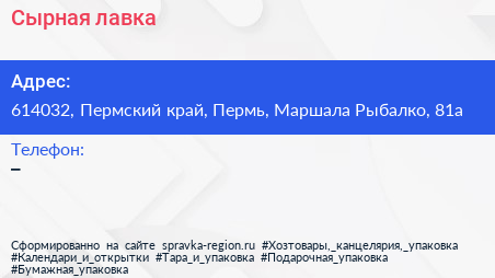 Сырная лавка по адресу 614032, Пермский край, Пермь, Маршала Рыбалко, 81а в дальнейшем Организация, размещена в следующих категориях:
