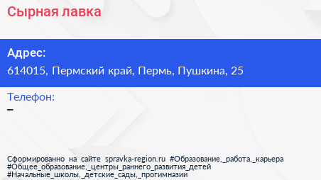 Сырная лавка по адресу 614015, Пермский край, Пермь, Пушкина, 25 в дальнейшем Организация, размещена в следующих категориях: