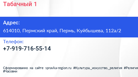 Табачный №1 по адресу 614010, Пермский край, Пермь, Куйбышева, 112а/2 в дальнейшем Организация, размещена в следующих категориях: