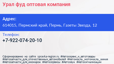 Урал фуд, оптовая компания по адресу 614015, Пермский край, Пермь, Газеты Звезда, 12 в дальнейшем Организация, размещена в следующих категориях: