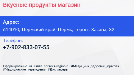 Вкусные продукты, магазин по адресу 614010, Пермский край, Пермь, Героев Хасана, 32 в дальнейшем Организация, размещена в следующих категориях: