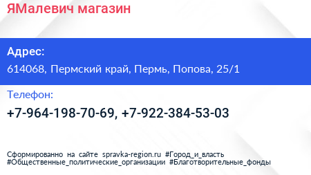 ЯМалевич, магазин по адресу 614068, Пермский край, Пермь, Попова, 25/1 в дальнейшем Организация, размещена в следующих категориях: