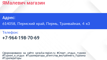 ЯМалевич, магазин по адресу 614058, Пермский край, Пермь, Трамвайная, 4 к3 в дальнейшем Организация, размещена в следующих категориях: