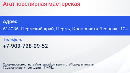 Агат, ювелирная мастерская по адресу 614036, Пермский край, Пермь, Космонавта Леонова, 10а в дальнейшем Организация, размещена в следующих категориях: