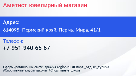 Аметист, ювелирный магазин по адресу 614095, Пермский край, Пермь, Мира, 41/1 в дальнейшем Организация, размещена в следующих категориях: