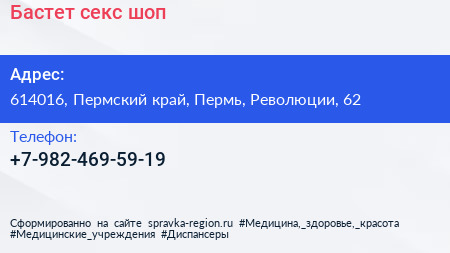 Бастет, секс-шоп по адресу 614016, Пермский край, Пермь, Революции, 62 в дальнейшем Организация, размещена в следующих категориях: