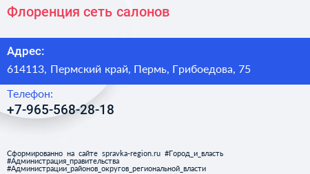 Флоренция, сеть салонов по адресу 614113, Пермский край, Пермь, Грибоедова, 75 в дальнейшем Организация, размещена в следующих категориях: