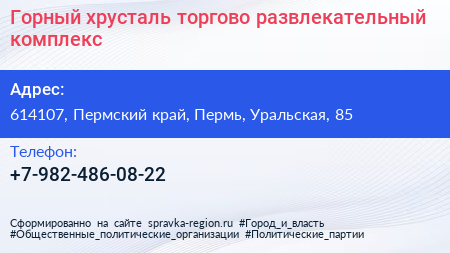 Горный хрусталь, торгово-развлекательный комплекс по адресу 614107, Пермский край, Пермь, Уральская, 85 в дальнейшем Организация, размещена в следующих категориях: