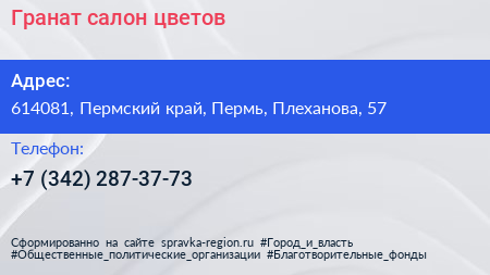 Гранат, салон цветов по адресу 614081, Пермский край, Пермь, Плеханова, 57 в дальнейшем Организация, размещена в следующих категориях:
