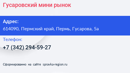 Гусаровский, мини-рынок по адресу 614090, Пермский край, Пермь, Гусарова, 5а в дальнейшем Организация, размещена в следующих категориях:
