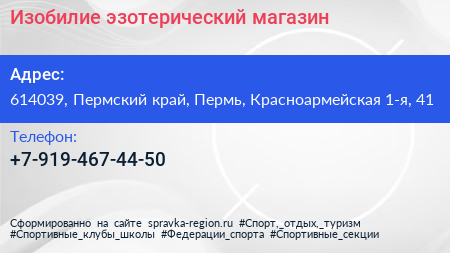 Изобилие, эзотерический магазин по адресу 614039, Пермский край, Пермь, Красноармейская 1-я, 41 в дальнейшем Организация, размещена в следующих категориях: