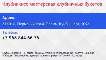 Клубникисс, мастерская клубничных букетов по адресу 614010, Пермский край, Пермь, Куйбышева, 109а в дальнейшем Организация, размещена в следующих категориях: