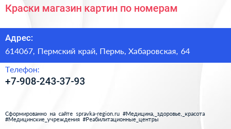 Краски, магазин картин по номерам по адресу 614067, Пермский край, Пермь, Хабаровская, 64 в дальнейшем Организация, размещена в следующих категориях: