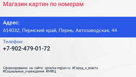 Магазин картин по номерам по адресу 614032, Пермский край, Пермь, Автозаводская, 44 в дальнейшем Организация, размещена в следующих категориях: