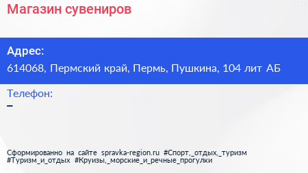 Магазин сувениров по адресу 614068, Пермский край, Пермь, Пушкина, 104 лит АБ в дальнейшем Организация, размещена в следующих категориях: