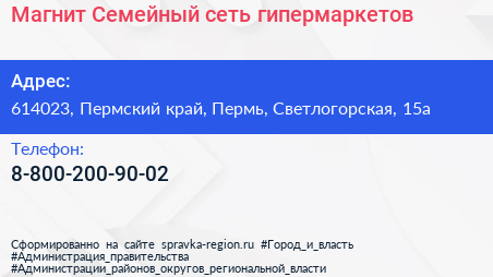 Магнит Семейный, сеть гипермаркетов по адресу 614023, Пермский край, Пермь, Светлогорская, 15а в дальнейшем Организация, размещена в следующих категориях: