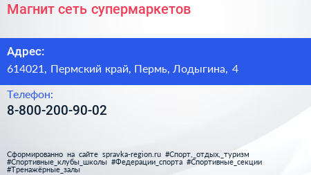 Магнит, сеть супермаркетов по адресу 614021, Пермский край, Пермь, Лодыгина, 4 в дальнейшем Организация, размещена в следующих категориях: