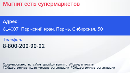 Магнит, сеть супермаркетов по адресу 614007, Пермский край, Пермь, Сибирская, 50 в дальнейшем Организация, размещена в следующих категориях: