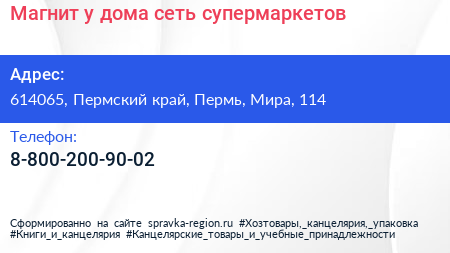 Магнит у дома, сеть супермаркетов по адресу 614065, Пермский край, Пермь, Мира, 114 в дальнейшем Организация, размещена в следующих категориях: