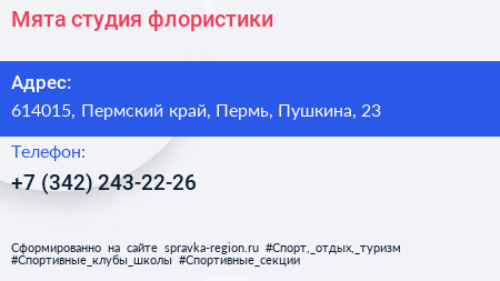 Мята, студия флористики по адресу 614015, Пермский край, Пермь, Пушкина, 23 в дальнейшем Организация, размещена в следующих категориях: