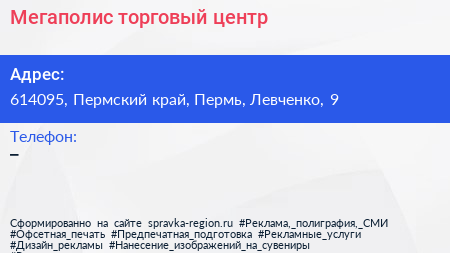 Мегаполис, торговый центр по адресу 614095, Пермский край, Пермь, Левченко, 9 в дальнейшем Организация, размещена в следующих категориях: