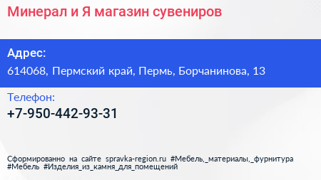 Минерал и Я, магазин сувениров по адресу 614068, Пермский край, Пермь, Борчанинова, 13 в дальнейшем Организация, размещена в следующих категориях: