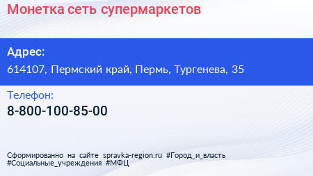 Монетка, сеть супермаркетов по адресу 614107, Пермский край, Пермь, Тургенева, 35 в дальнейшем Организация, размещена в следующих категориях: