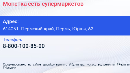 Монетка, сеть супермаркетов по адресу 614051, Пермский край, Пермь, Юрша, 62 в дальнейшем Организация, размещена в следующих категориях: