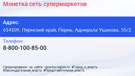 Монетка, сеть супермаркетов по адресу 614109, Пермский край, Пермь, Адмирала Ушакова, 55/2 в дальнейшем Организация, размещена в следующих категориях: