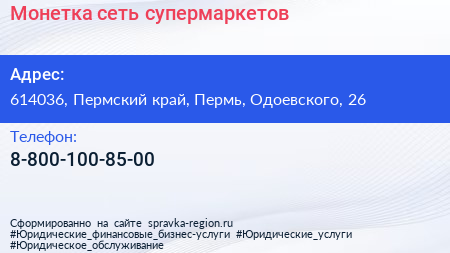 Монетка, сеть супермаркетов по адресу 614036, Пермский край, Пермь, Одоевского, 26 в дальнейшем Организация, размещена в следующих категориях: