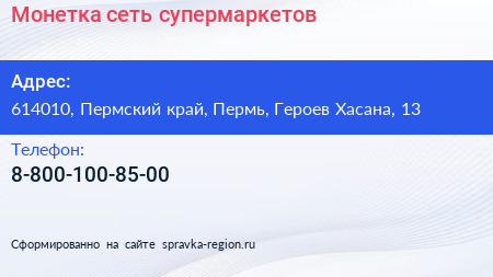 Монетка, сеть супермаркетов по адресу 614010, Пермский край, Пермь, Героев Хасана, 13 в дальнейшем Организация, размещена в следующих категориях: