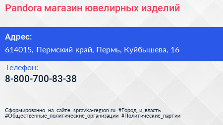 Pandora, магазин ювелирных изделий по адресу 614015, Пермский край, Пермь, Куйбышева, 16 в дальнейшем Организация, размещена в следующих категориях: