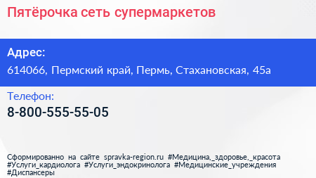 Пятёрочка, сеть супермаркетов по адресу 614066, Пермский край, Пермь, Стахановская, 45а в дальнейшем Организация, размещена в следующих категориях: