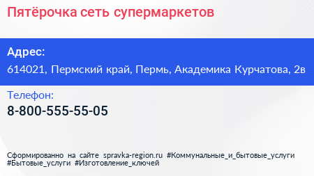 Пятёрочка, сеть супермаркетов по адресу 614021, Пермский край, Пермь, Академика Курчатова, 2в в дальнейшем Организация, размещена в следующих категориях: