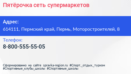 Пятёрочка, сеть супермаркетов по адресу 614111, Пермский край, Пермь, Моторостроителей, 8 в дальнейшем Организация, размещена в следующих категориях: