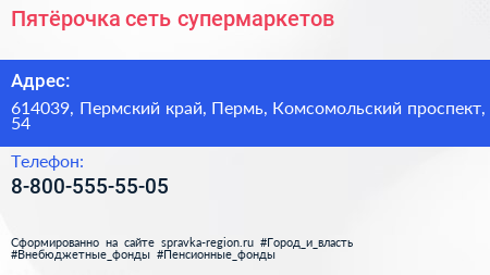Пятёрочка, сеть супермаркетов по адресу 614039, Пермский край, Пермь, Комсомольский проспект, 54 в дальнейшем Организация, размещена в следующих категориях: