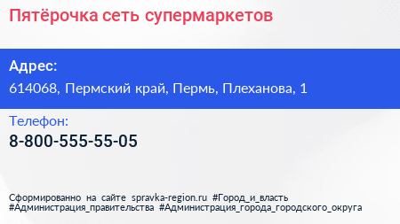 Пятёрочка, сеть супермаркетов по адресу 614068, Пермский край, Пермь, Плеханова, 1 в дальнейшем Организация, размещена в следующих категориях: