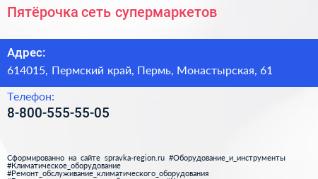 Пятёрочка, сеть супермаркетов по адресу 614015, Пермский край, Пермь, Монастырская, 61 в дальнейшем Организация, размещена в следующих категориях: