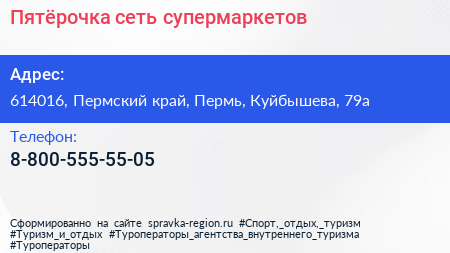 Пятёрочка, сеть супермаркетов по адресу 614016, Пермский край, Пермь, Куйбышева, 79а в дальнейшем Организация, размещена в следующих категориях: