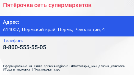 Пятёрочка, сеть супермаркетов по адресу 614007, Пермский край, Пермь, Революции, 4 в дальнейшем Организация, размещена в следующих категориях: